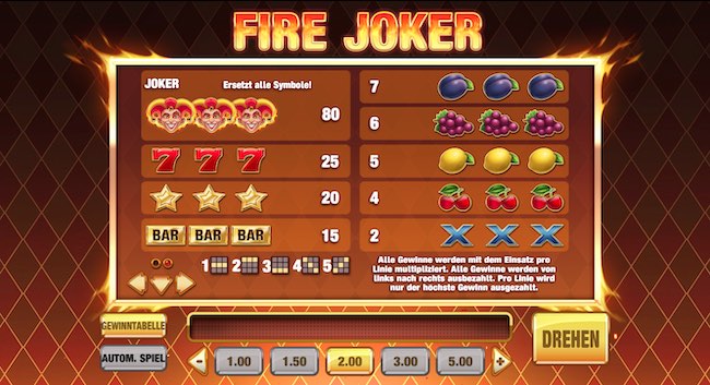 Damit ein Gewinn entsteht, müssen immer drei gleiche Symbole auf einer Gewinnlinie auftauchen. Zudem gibt es drei Joker, die dir sogar den 80-fachen Gewinn einbringen können. Obwohl der Fire Joker Slot relativ einfach gestaltet ist, hat es dieser Spielautomat in sich. Es kann sogar zu einem richtig aufregenden Erlebnis werden, wenn Sie im Fire Joker Casino den Spielautomaten spielen. Im unteren Bereich des Fire Joker Slots kannst du deine Einsätze einstellen. Von 0,05 Euro bis hin zu 100 Euro pro Drehung ist alles möglich. Bist du vorsichtig, kannst du mit einem kleinen Einsatz Fire Joker um Echtgeld spielen. Es gibt auch eine Autoplay-Funktion, sodass du auch ganz automatisch das Spiel laufen lassen kannst, ohne jedes Mal die Walzen erneut in Gang zu setzen.