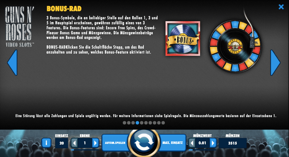 Für Fans von Guns N‘ Roses lohnt sich ein Anspielen allein schon wegen der Band-Thematik, aber auch ohne die Original-Lizenz wäre dieser Slot zumindest einen Test wert. Denn die Mini-Spiele und Zusatz-Features lockern die regulären Drehs kurzweilig und unterhaltsam auf und vergrößern gleichzeitig die Gewinnchancen. Erscheinen drei Bonus-Symbole irgendwo auf den Walzen eins, drei und fünf, so beginnt automatisch das „Bonus Wheel“, das „Crowd-Pleaser Bonus Game“ oder die „Encore Free Spins“. Das schallplattenförmige „Bonus Wheel“ ist ein Glücksrad, das Freispiele oder Geldbeträge ausschüttet.