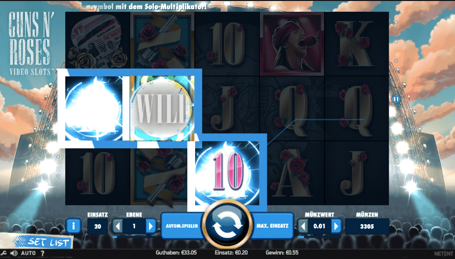 Stellvertretend für jedes Gründungsmitglied von Guns N‘ Roses verfügt der Slot über fünf Walzen. 20 Gewinnlinien befinden sich darauf – und alle 20 sind aktiviert, sodass du zwischen den Drehs nicht selbst entscheiden kannst, wie viele du anwählst. Pro Gewinnlinie kannst du zwischen einem Cent und einem Euro einsetzen, der Minimaleinsatz pro Dreh beträgt also 20 Cent. Indem du das Bet-Level von eins bis zu zehn steigerst, kannst du den Maximaleinsatz auf 200 Euro erhöhen.