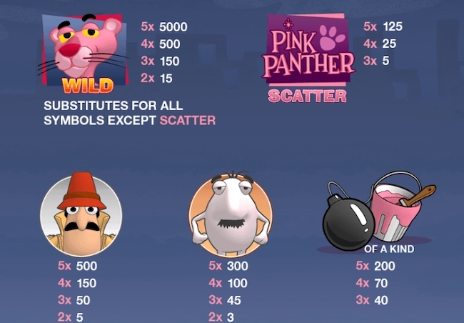 Zu den Symbolen gehören natürlich zunächst einmal die ganz typischen Symbole wie J, Q, K und A. Diese Symbole sorgen für kleinere Gewinne, können aber trotzdem recht lukrativ sein und einige Gewinne einbringen. Die Hauptcharaktere aus der Pink Panther Serie sind natürlich in dem Spielautomaten stark präsent und sorgen für viele Besonderheiten und mit ein bisschen Glück hohe Gewinne. Zu den wichtigsten Symbolen gehören natürlich der Panther und der Inspektor. Weitere besondere Symbole mit spannenden Gewinnen sind unter anderem der weiße Mann, die Bombe, der Eimer, die Lupe, die Fußspuren und das Pink Panther Logo.
