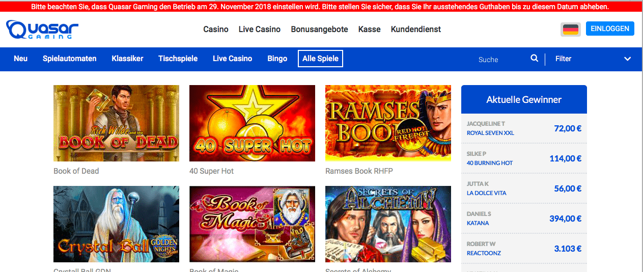 „Wir möchten Sie darauf hinweisen, dass sich das Management von Quasar Limited bedauerlicherweise dazu entschlossen hat, seine Geschäftstätigkeit über quasargaming.com zum 29. November 2018 einzustellen. Falls Sie zu diesem Zeitpunkt ein noch ausstehendes Guthaben auf Ihrem Konto haben, können Sie sich noch für eine begrenzte Zeit anmelden und dieses zur Auszahlung beantragen. Wir bitten Sie daher dringend, eine solche Auszahlung möglichst bald anzufragen.“
